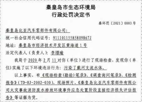 2021年1月29日,秦皇岛比亚汽车零部件有限公司因污染戴河支流水体,被秦皇岛市生态环境局处以罚款480167.58元(秦环罚〔2021〕0003号)。