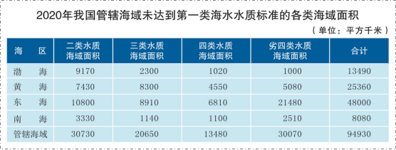 《2020年中国海洋生态环境状态公报》[21]显示,2020年渤海未达到第一类海水水质标准的海域面积为13490平方千米,同比增加750平方千米。