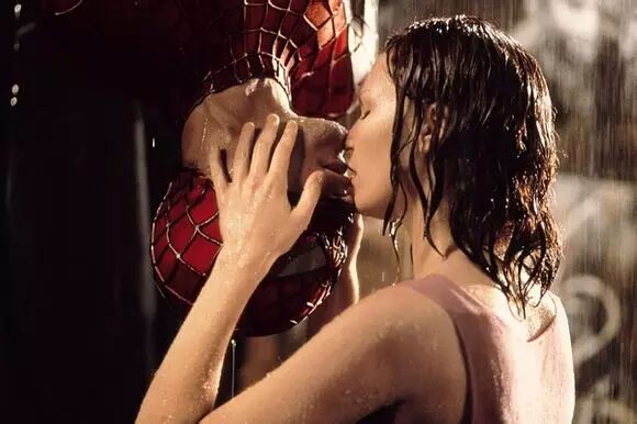 35、《蜘蛛侠》2002年托比·马奎尔VS克里斯·邓斯特在一个陋巷里,玛丽被几个街头混混调戏,这时,蜘蛛侠从天而降,第二次成功解救了玛丽。玛丽为表示感谢,与倒挂的蜘蛛侠在雨中浪漫接吻。这场戏,因为是下雨场景,又需要主角倒挂,所以给托比的鼻子里塞了棉球。对台词时,托比只能发出嗯嗯的声音,邓斯特就只能假装听懂。