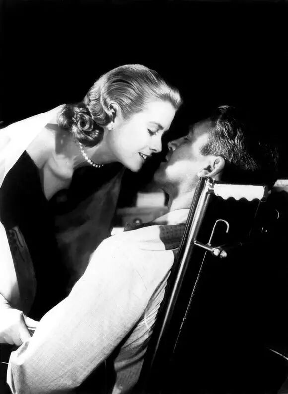 10、《后窗》1954年詹姆斯·斯图尔特VS格蕾丝·凯利 詹姆斯·斯图尔特正在打瞌睡,暖融融的太阳穿过院子照在房间的后窗上,一道阴影慢慢掠过他的脸庞,最后定格为凯莉的特写镜头———她俯下身来,给了他一个温柔的吻。斯图尔特醒来,被眼前的美人陶醉了。