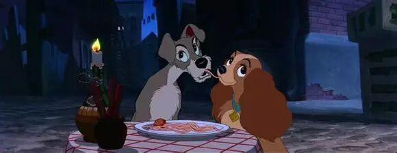 11、《小姐与流浪汉》1955年纯种可卡“小姐”与杂种狗“流氓”在一个意大利餐馆吃通心粉,两只狗分别从两头开始吃一根通心粉,两张嘴巴不可避免地在中间相遇,轻轻地吻了一下。然后“流氓”把盘子里最后一个肉丸子送给了“小姐”。这个经典的接吻镜头后来在很多电影中被模仿。