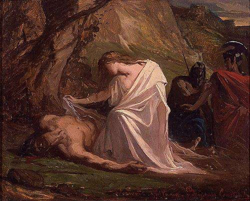 在此,歌队赞美爱神爱罗斯(Eros)其实就是赞美爱欲,因为安提戈涅的辉煌之美就来源于她决不妥协的欲望。安提戈涅的美辉煌而壮丽,令人难以直视,从她身上放射出的光华似乎可以熔化一切,因为她那毫不妥协的决绝行动令人震惊。安提戈涅绝不是一个可以让人认同的对象,对所有常人来说,她都是一个让人难以理解而且不可承受的悲剧英雄。我们必须回答一个问题:安提戈涅明知为波吕涅克斯举行葬礼的后果只能是死路一条,那她为什么非得要这么做呢?对此安提戈涅似乎在剧本中为我们给出了答案: