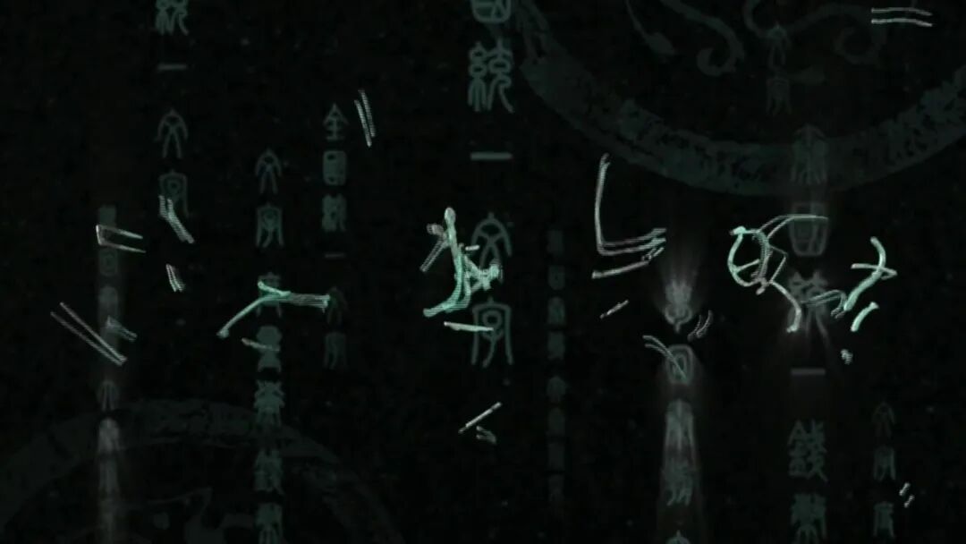 镜头四:在一条崎岖不平的羊肠小道上,一位老者赶着一头驴,驴背上叮当作响,上面都是用绳子捆在一起的骨头片,而骨头上又刻满了弯弯曲曲的文字。驴的后面跟着一群狗,汪汪乱叫,想吃驴背上的骨头。