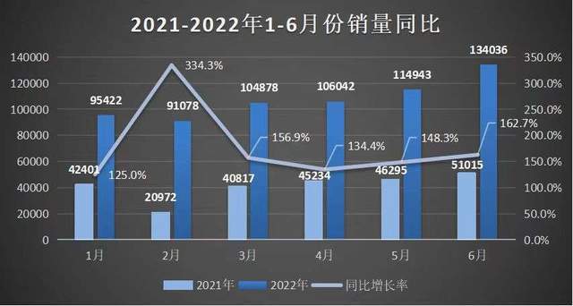 从2022年比亚迪新能源汽车销量是逐月呈直线上升趋势,基本每个月都会有10万辆的销售量,相比较2021年增长趋势明显。通过比亚迪6月产销快报来看,明显加快了生产销售速度,6月比亚迪销售134036辆,同比增长162.7%,环比增长16.6%,增长速度迅猛,每个月都是新的突破。