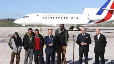 四个法国人质(左边三个和右三)获释