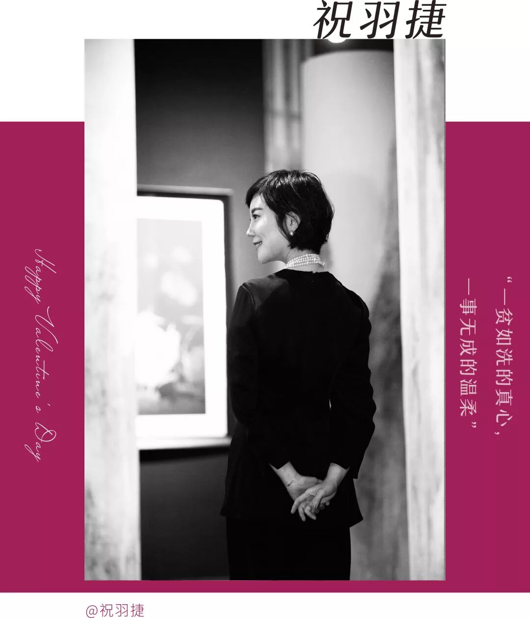 关键词:低调、绵长 祝羽捷说:“《芳华》里描绘我们小时候的那种爱很准确:‘那是个混账的年龄,你心里身体里都是爱,爱得浑身满心乱窜,给谁是不重要的’。那个时候我们不懂爱,爱却排山倒海,日日夜夜,看似永远用不完。后来我们终于学会了什么是爱,却发现没有那么多力气了,只能爱少量的人,但要爱得精致,爱得绵长。我的爱情刚好经历了这两个阶段。从年轻时候的无知无畏到现在的细水长流。”祝羽捷的另一半是某IT公司的CEO,非常低调,在祝羽捷眼中,他是一位细心、善良、宽容的人。