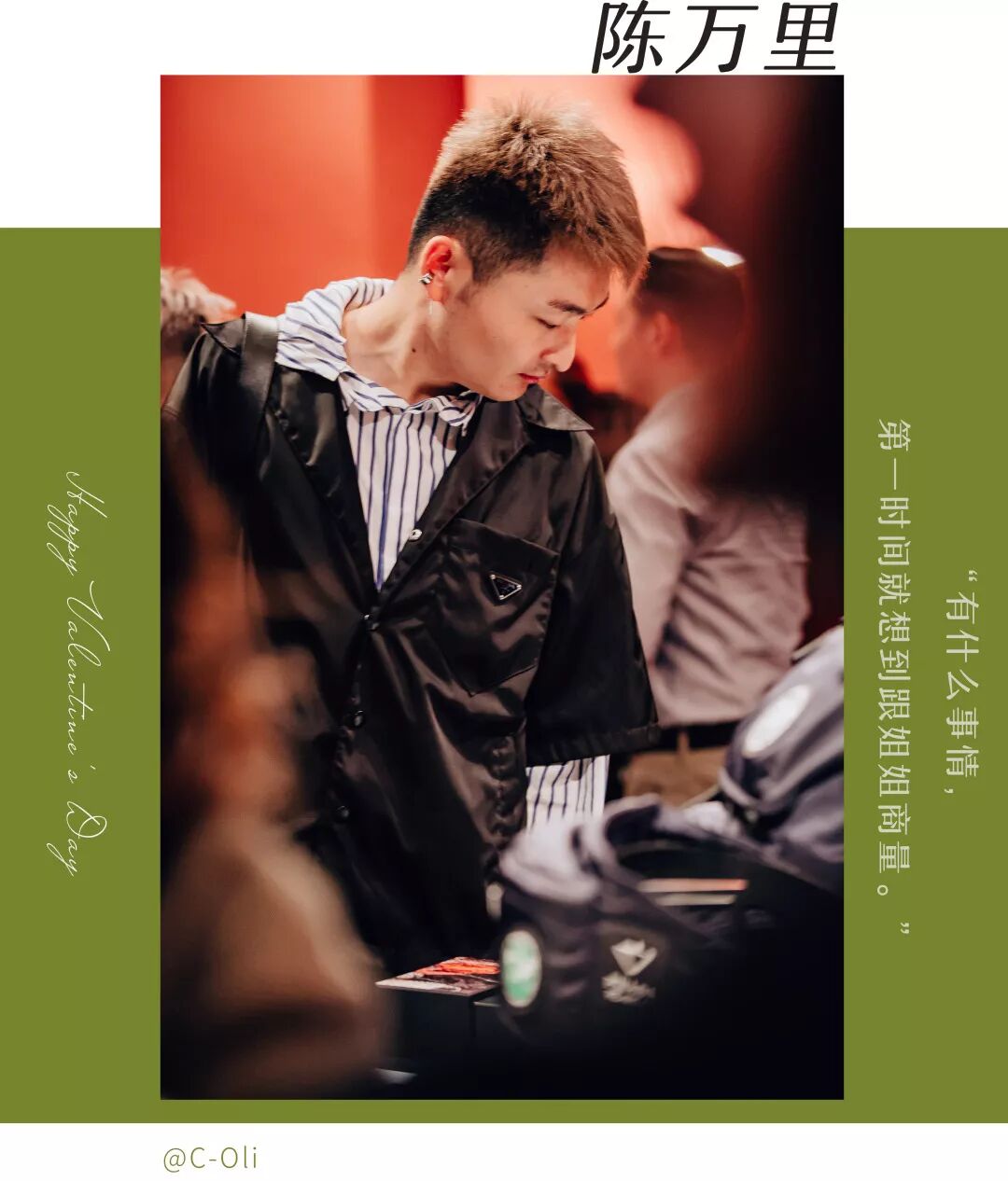 关键词:姐姐、香水、留学 刘雯被粉丝们亲切地称呼为大表姐,而陈万里也有一位对他给予极大支持的亲姐。小时候想买什么衣服鞋子都是直接跟姐姐说,出国留学也是姐姐陪着一起挑学校,毕业回国,姐姐帮忙在上海找租房。陈万里有什么事情,第一时间就想到跟姐姐商量。 印象深刻的礼物是姐姐送给自己的一瓶香水。2015年要出国留学临行前,一边打包行李一边和姐姐闲聊聊到了香水。姐姐问他有没有用过香水,陈万里笑道说:“怎么可能,你弟弟我现在洗完脸都只用爽肤水,哪有那么精致”。姐姐听完轻叹一声,转身去了房间,过一会拿出一盒宝格丽男士香水套装,说:“也是要出国的人了,以后可是要越来越精致才行,要不然找不着对象咋办,来自己挑一个喜欢的味道吧”。就这样,陈万里拥有了人生的第一款香水。