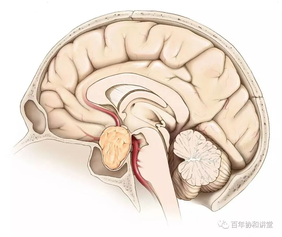 脑垂体并不是孤零零地躺在蝶鞍内,垂体的上部经垂体柄与下丘脑相连,它起到承上启下的作用。