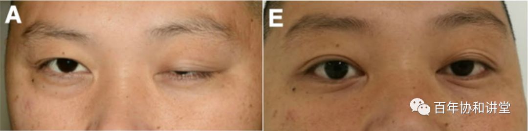图:急性垂体卒中患者发病时左侧上眼睑下垂,眼球活动受限(A,术前),手术后三个月基本恢复正常(E,术后)