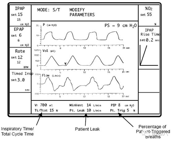 不同型号的呼吸机稍有不同,但一般包括 IPAP,EPAP,呼吸频率,呼出潮气量(Vt),分钟通气量(MV or MinVent),气道峰压(PIP),吸气时间 : 呼气时间(I:E),漏气量及病人自主触发比率等。由于没有插管,所以 Vt 仅是估计量。