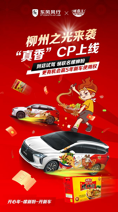 东风风行与螺霸王都是坚持创新的中国民族品牌的代表。东风风行是东风柳州汽车有限公司旗下的乘用车品牌,自2001年成立以来,一直在商务车领域匠心耕耘。2001年推出的菱智是中国品牌首款MPV,上市至今累计用户超100万,是中大型商用MPV市场的销量冠军。经过二十多年的发展,东风风行已成为中国自主品牌的标杆。作为中国“网红”美食,螺蛳粉因其鲜、香、酸、辣、爽等独特风味走红海内外。此次,东风风行跨界联合螺霸王,借势柳州本地特色符号,助力品牌年轻化更上一个台阶,期待能给广大用户带去一份印象深刻、久久回“味”的新春体验。