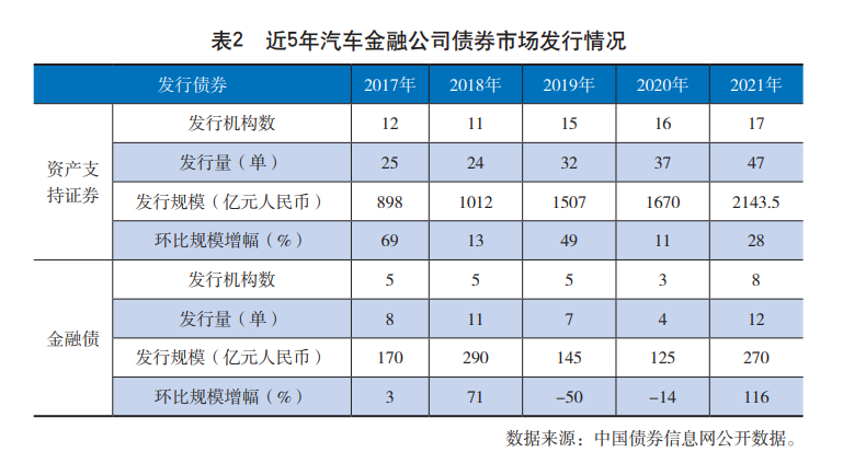 目前,越来越多的汽车金融公司选择在中国银行间债券市场发行两只债券:资产支持证券(ABS)和金融债。2021年共有17家汽车金融公司发行了47单资产支持证券,总发行规模达2143.5亿元人民币,比2020年增加28.35%;8家汽车金融公司发行了12单金融债,总发行规模为270亿元人民币,比2020年增加116%。