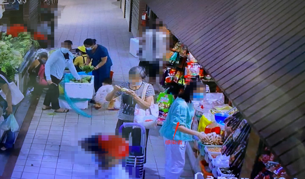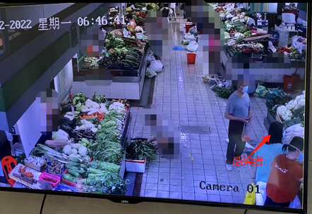于8月22日6:41—6:50左右,在城金农贸市场蔬菜摊(详见图,箭头指向人员为新冠病毒感染者)。