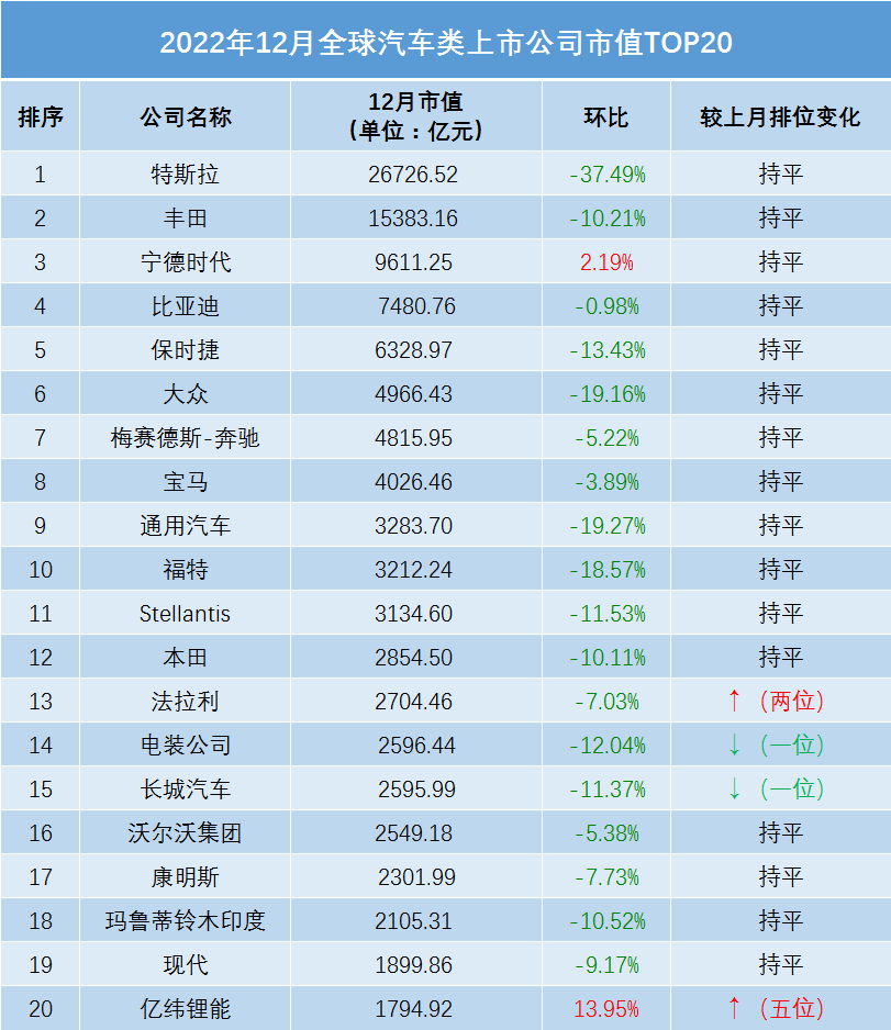 2022年全球车企收官市值:头部格局稳固,跌多涨少贯穿全年