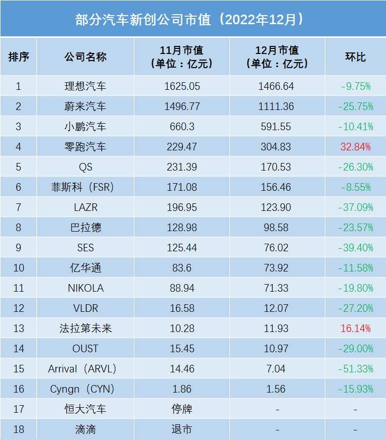 2022年金融市场极不平静,新势力与初创公司的市值也经历了残酷的下跌。纵观全年,几乎没有一家新势力与初创公司的市值上涨。