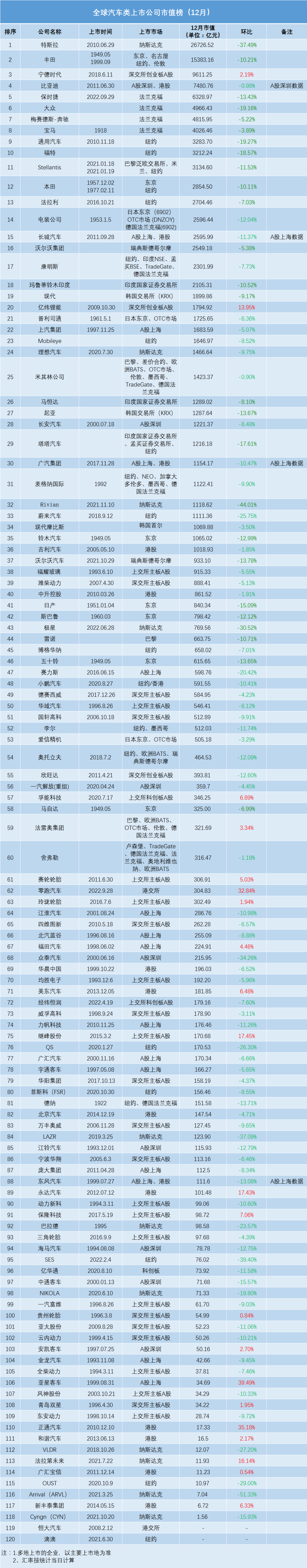 2022年12月,《中国汽车报》汽车市值研究组继续对全球汽车类上市公司月度市值变化进行全面跟踪、梳理和比较分析。12月,全球汽车类上市公司的统计范围依然涵盖国际和国内上市的主流整车、零部件企业,以及主要新创公司和国内汽车经销商集团。12月统计的上市企业数量共计120家。