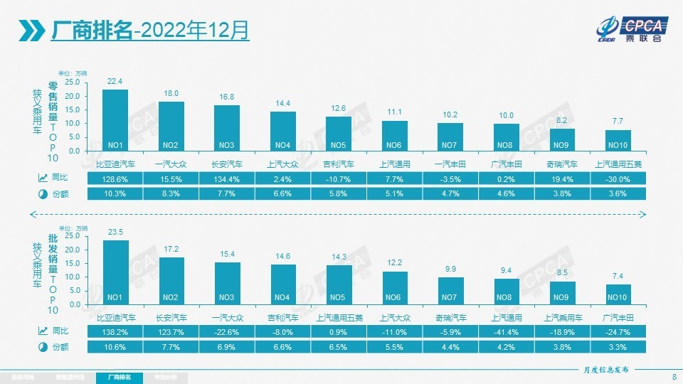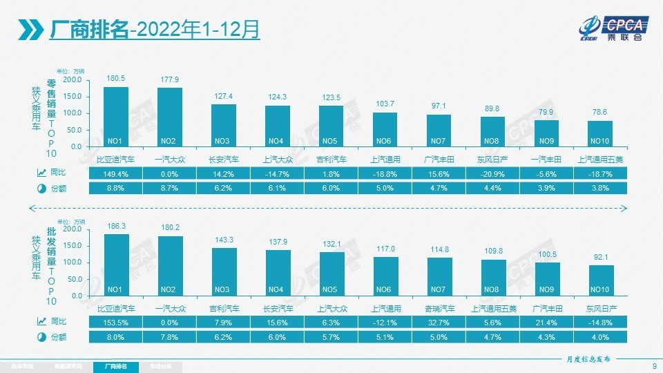 值得关注的是,1-12月自主品牌累计份额50%,相对于2021年同期增加6个百分点。自主品牌在新能源市场和出口市场获得明显增量,这也让比亚迪汽车、吉利汽车、长安汽车、奇瑞汽车等传统车企品牌份额提升明显。