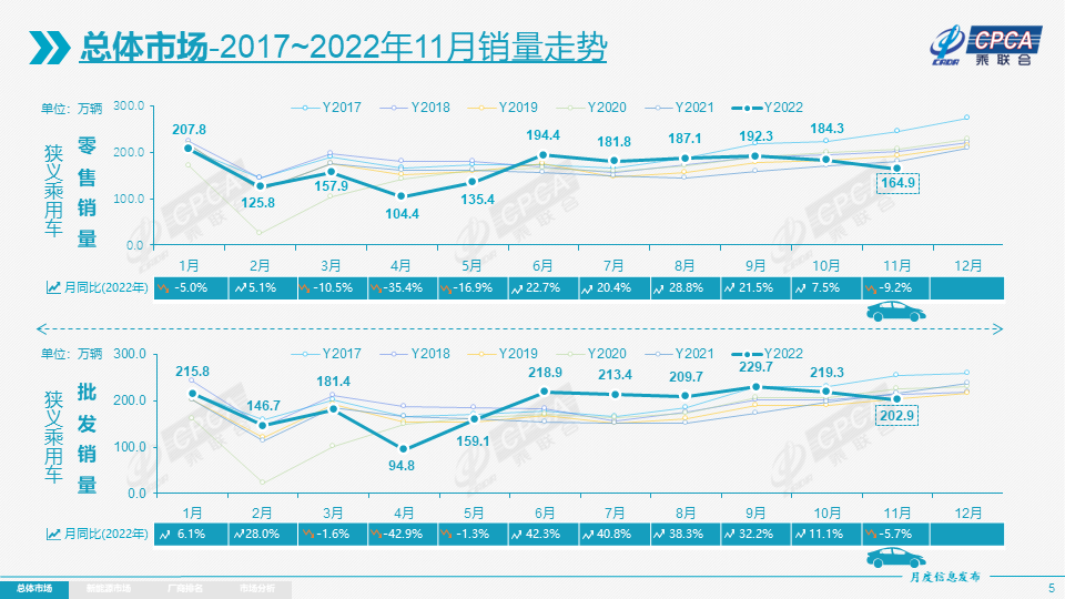 12月8日,乘联会发布2022年11月全国乘用车市场销量。其数据显示,11月,乘用车市场零售达到164.9万辆,同比下降9.2%;11月零售环比下降10.5%,这是自2008年以来首次出现“金九银十铜十一”的环比下降特征。1-11月累计零售1836.7万辆,同比增长1.8%,同比净增31.7万辆,其中购车税优惠政策启动以来的6-11月同比增加139万辆,增量贡献巨大。