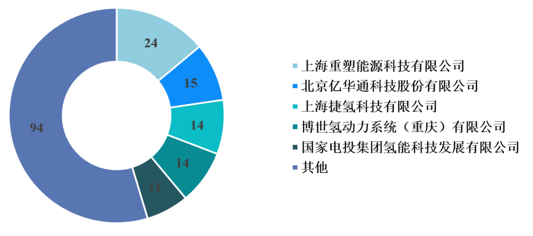 入选的289个车型共配套99家燃料电池系统厂家。其中,上海重塑能源科技有限公司累计配套24个车型,排名第一;北京亿华通科技股份有限公司、上海捷氢科技有限公司、博世氢动力系统(重庆)有限公司与国家电投集团氢能科技发展有限公司配套车型数量排名第二到第五,分别为15个,14个,12个与11个。前五名燃料电池企业合计配套车型占比44.7%。
