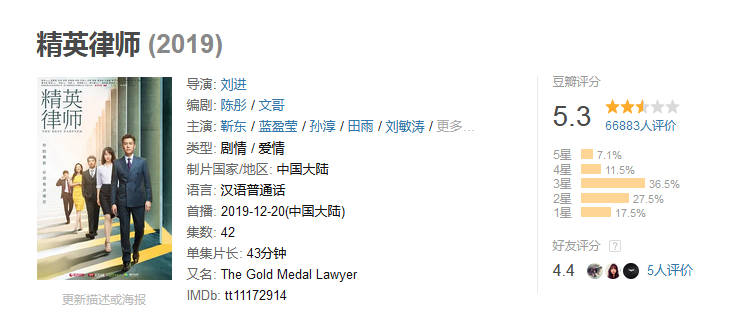 靳东和蓝盈莹主演的《精英律师》豆瓣给出5.3分,不算好,总之很难及格。行业剧拍不好的原因,可能是编剧们不是律师,所以写不出好的剧本,导致电视剧播出后无法获得观众额喜爱。