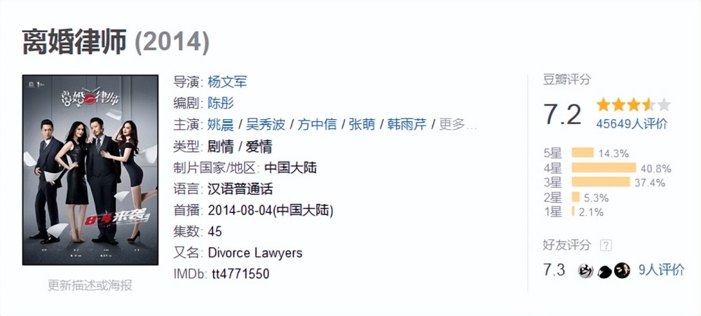 吴秀波和姚晨主演的《离婚律师》,豆瓣给出7.2分还不错,这部剧其实拍得也不是很专业,因为专业的东西大家看不懂,所以呈现出来的内容还要显得既专业又要通俗,通俗是需要大家看懂,这个尺度如何很难拿捏。
