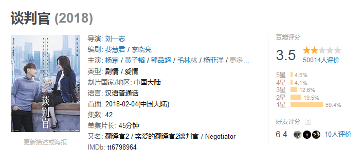 杨幂和黄轩以及黄子韬分别主演的《亲爱的翻译官》和《谈判官》在豆瓣的口碑都不是很好,特别是《谈判官》完全被拍成偶像剧,豆瓣评分才3.5分,这分太低了。