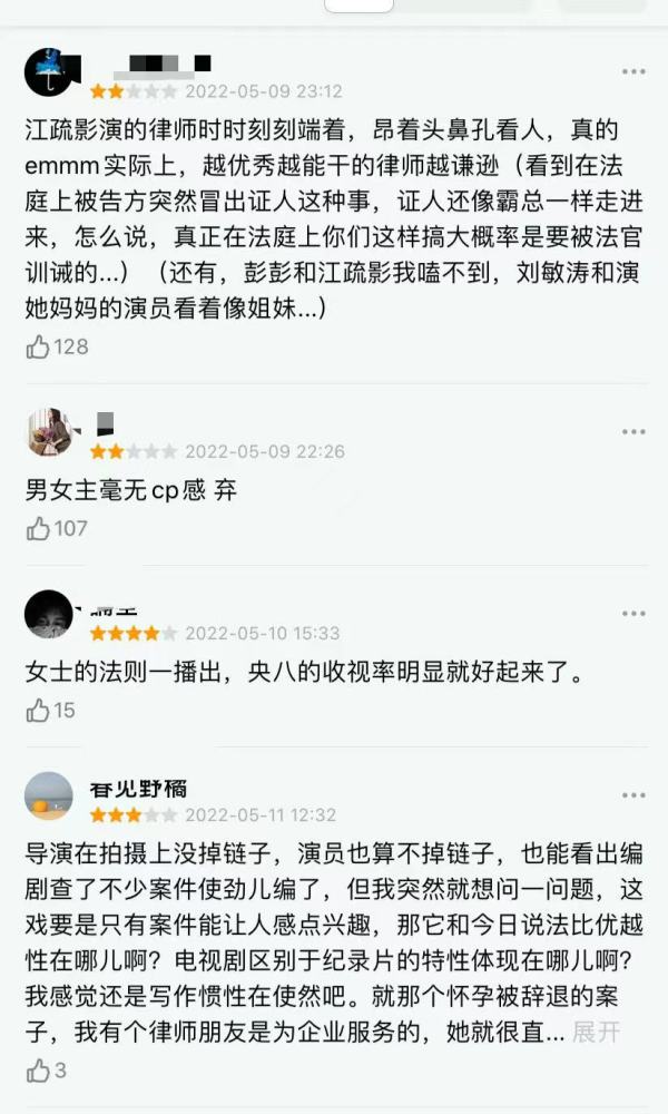 网友们的评价都很中肯,没有蓄意去抹黑,应该是实事求是。江疏影可能没见到过不同的律师,律师不是用鼻子看人,而是用眼睛看人,看得很仔细。的确就像网友们评价的,律政剧如果突出案件的看点,那么就很容易像纪实作品,如果为了迎合观众口味,则很容易成为偶像剧或家庭伦理剧。