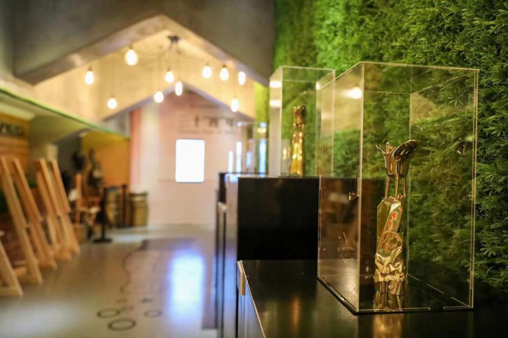 最令人瞩目的无疑是展示柜中,5代金爵奖杯齐聚一堂。上影节初创期的工作人员介绍,当年“金爵奖”的命名有过很多方案,包括浦江杯、申花杯等,最后才从《诗经》中汲取灵感,选择了中国青铜器时代的标志金爵酒杯,体现东方文明古国的传统文化内涵。初代金爵奖杯的造型也能反映当年的创意——上影节最初的设想是在金爵奖杯下方缠绕电影胶片,可惜由于胶片挂不住,而且效果不佳,最后才确定下用金属制作的胶片造型底座。