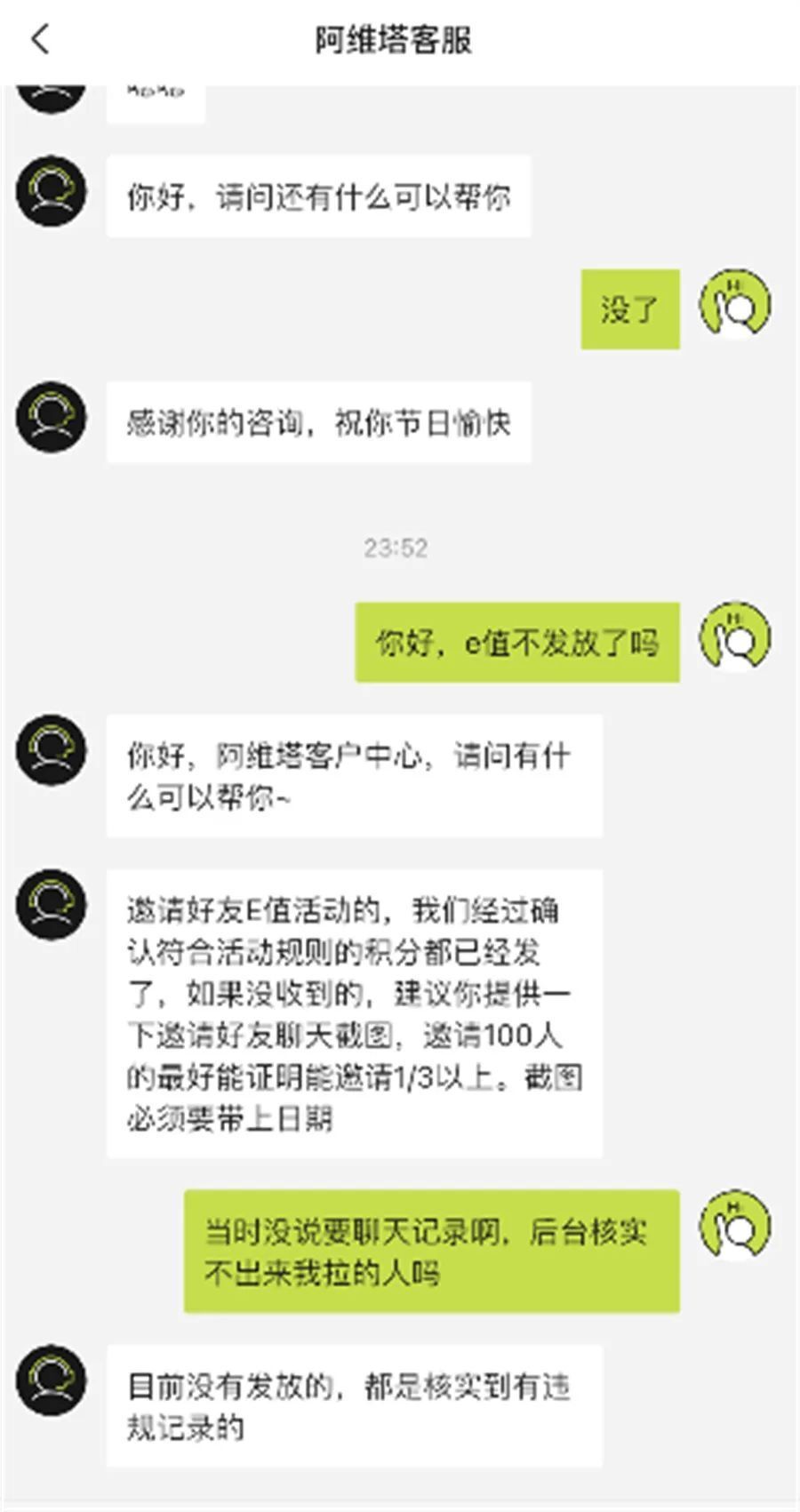 一位网友称,自己在活动期间成功邀请100人注册,且阿维塔APP活动页面也显示成功100人,但是直到超出规则约定的奖励发放日期,阿维塔APP仍旧没有发放活动奖励。当该网友就此事咨询后台客服时,客服却称,邀请好友E值活动的,官方经过确认符合活动规则的积分都已经发放了,如果没收到,建议提供邀请好友聊天截图,邀请100人的最好能证明邀请三分之一以上,且截图必须要带上日期。