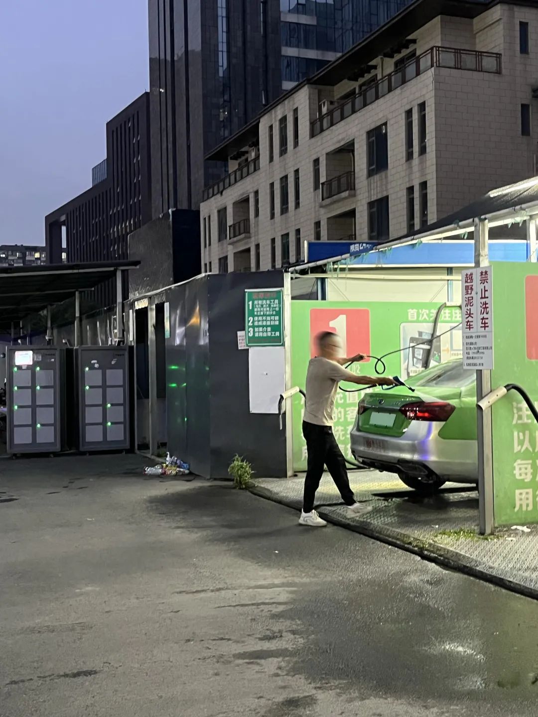 对网约车、出租车司机来说,冲洗掉最显眼的污渍,将车辆保持在一个基本清洁水平,且不用太贵,也不会太费时。洗完车刚好隔壁的充电桩空闲了出来,完成功能性的高效连接。