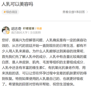 网上也有一些关于人乳是否可以美容的问答,一些所谓的专家的回答也引导了大众的错误认知。
