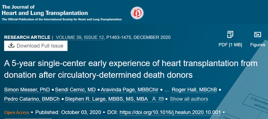 2020年,英国剑桥皇家帕普沃斯医院(RPH,Royal Papworth Hospital)的一个团队公布了一项为期五年的单中心、回顾性、配对、观察性临床队列研究的结果。该研究比较了NRP-DCD心脏移植手术和脑死亡后捐献(DBD,donation after brain death)心脏移植手术这两种方法的30天及1年患者存活率。结果显示,与传统的DBD心脏移植相比,DCD心脏捐献使该医院的整体心脏移植手术增加了48%(DCD手术79例,DBD手术164例),而在患者存活率方面,在30天(DCD手术为97%,DBD手术为99%)或1年(DCD手术为91%,DBD手术为89%)的时间点上均没有显示出差异。也就是说,来源于DCD的心脏捐献将大大增加可以从心脏移植中受益的患者数量。