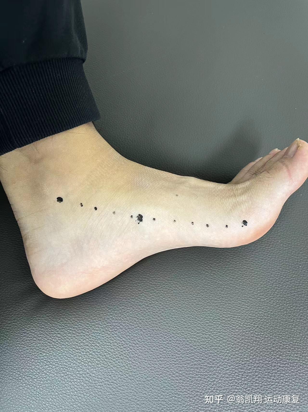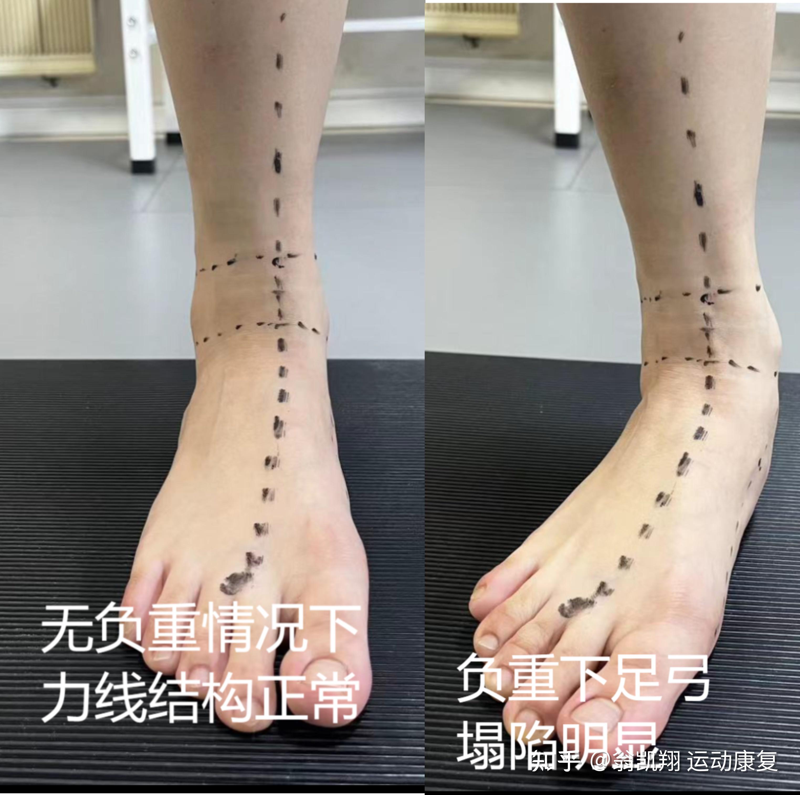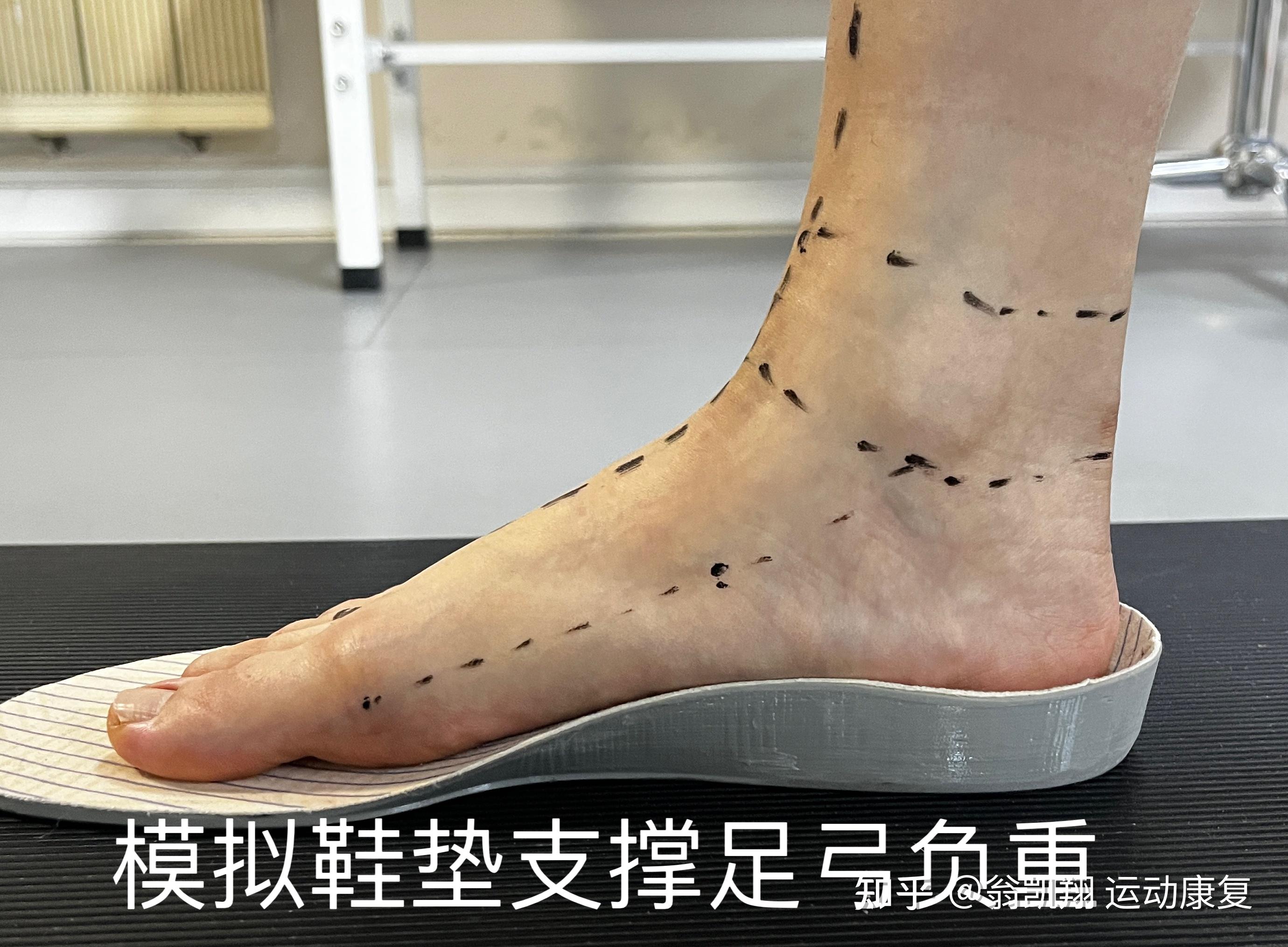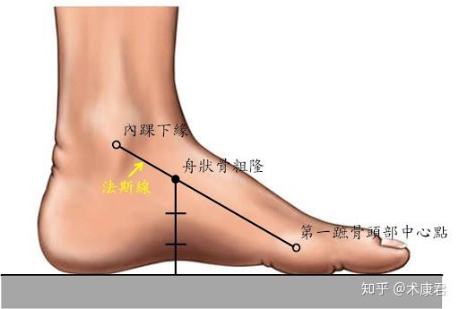 我们可以坐在椅子上,用记号笔,在脚上画三个点来观察我们的足弓,分别找到内踝下端点、足舟骨粗隆、大脚趾球,三点连成一条线