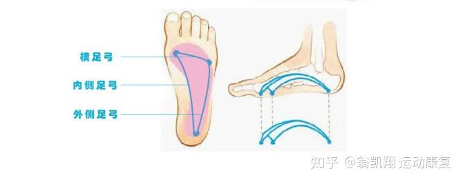 足弓是由足底内外侧的两条纵弓,和前脚掌的横弓共同组成。这三个弓形结构在脚底形成一个三角形。