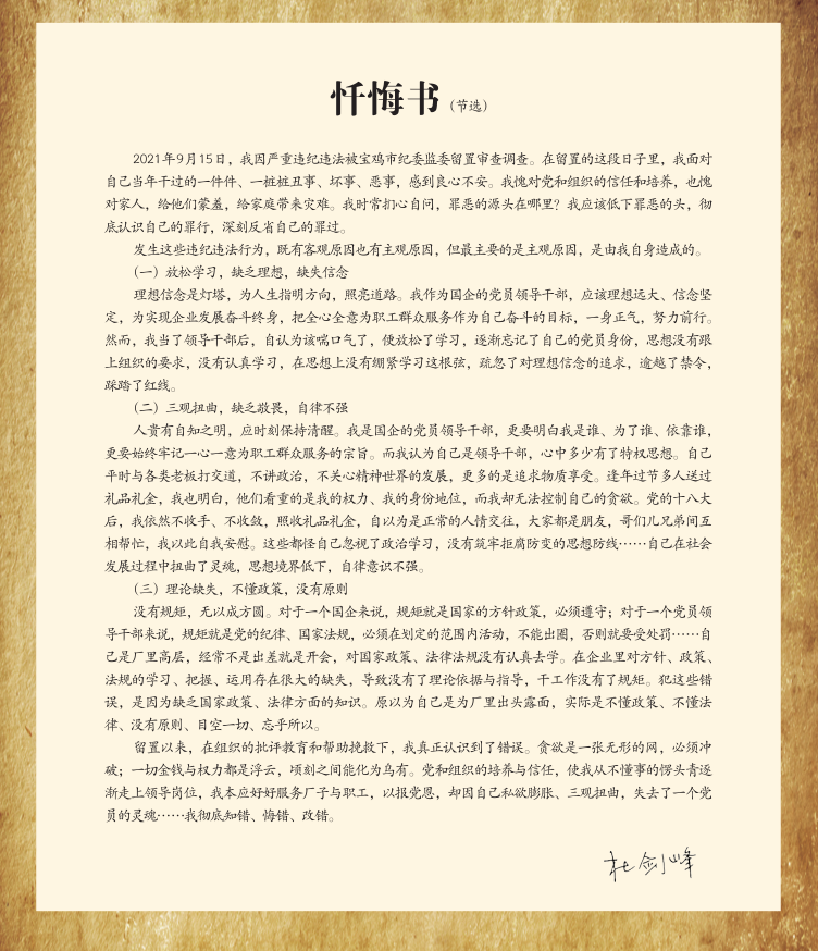 2021年初,宝鸡市纪委监委成立调查组,对十二届宝鸡市委第八轮巡察中发现移交的问题线索——陕西宝棉纺织集团有限公司领导班子成员有关违纪违法问题展开调查。2021年7月13日,对该公司下属子公司陕西昌荣纺织有限责任公司原副总经理杜剑峰涉嫌严重违纪违法问题立案调查,9月15日,经陕西省纪委监委批准,对杜剑峰采取留置措施。如今的杜剑峰,不再是受人尊重、令人崇拜的国企领导干部,也失去了作为一名共产党员的荣耀。“开除党籍那一天我很痛苦……我的老父亲是党员,到现在还是党员,没想到我被组织开除党籍。”想起入党时的誓言,杜剑峰痛彻心扉。小时候,父亲对杜剑峰说过:“社会大得很,人不光活自己,还要为大多数人活着。”身为一名国企领导干部,杜剑峰担负着实现国有资产保值增值的职责,是要为大多数人谋利益的。而他却认为自己该喘口气了,便放松了学习,放松了对理想信念的追求,逾越了禁令,踩踏了红线。“自己桌边党员干部学习的书籍一天一天多起来,而自己的学习却一天一天放松下去,得了‘软骨病’,做人的底线也开始动摇。”杜剑峰说,自从忘记了学习,思想变得空虚,所有的心思全用在了对金钱的追求上。在诱惑面前,杜剑峰没有及时刹车。他堕落腐化的根本原因在于放松党性修养,逃避自我改造。思想滑坡、精神缺“钙”的他很快沦为贪欲的俘虏,成为党的肌体上必须剔除的毒瘤。“贪欲是无止境的,就像魔鬼,住进你的心里,无法自拔。自控力没有了,什么都想,什么都没有拒绝。归根到底,还是私心膨胀、毫无敬畏,没有筑牢拒腐防变的思想防线,没有守住做人底线,没有划定做事红线,倒在了金钱、利益的枪口下,一步步走上了违法犯罪的道路,葬送了自己的大好前程。”在忏悔书中,杜剑峰这样写道。树朽先朽于根,人毁先毁于心。只有自觉摒弃侥幸心理,管住欲望,方能“知足者富,知止者久”。据杜剑峰回忆,刚当上领导时,他满怀喜悦回到家,将被提拔一事告诉了母亲。母亲对他说:“娃,妈给你说,你可不敢拿人家东西。”可惜的是,杜剑峰并没有牢记母亲的告诫。贪欲是无形的烈火,一切金钱与权力在顷刻之间化为了乌有。“身后有余忘缩手,眼前无路想回头。”在忏悔书中,杜剑峰再次回忆起父亲的谆谆教导和母亲的苦口良言,心中满是悔恨。(相关素材由宝鸡市纪委监委提供)