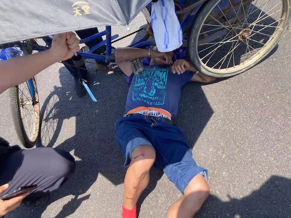 据了解,老伯姓蔡,今年64岁,当天中午在好友家吃完午饭骑行回家途中,因中暑头晕且体力不支,不知不觉骑到了马路中央,晕倒时手臂恰巧卡在了三轮车脚蹬的蹬轴缝间,所幸路过的群众发现及时报警。目前,蔡老伯经医院救治已无大碍。