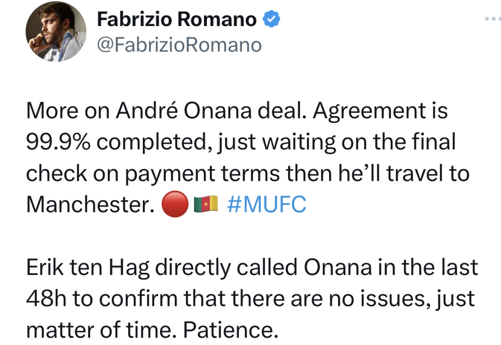 稍早前,罗马诺再次报道了奥纳纳加盟曼联的最新进展。他表示,关于奥纳纳的交易,协议已经完成了99.9%,只待付款结构的最终确认,然后他将前往曼彻斯特。滕哈格在最近48小时内直接电话联系了奥纳纳,确认没有问题,转会只是时间问题,耐心等待吧。