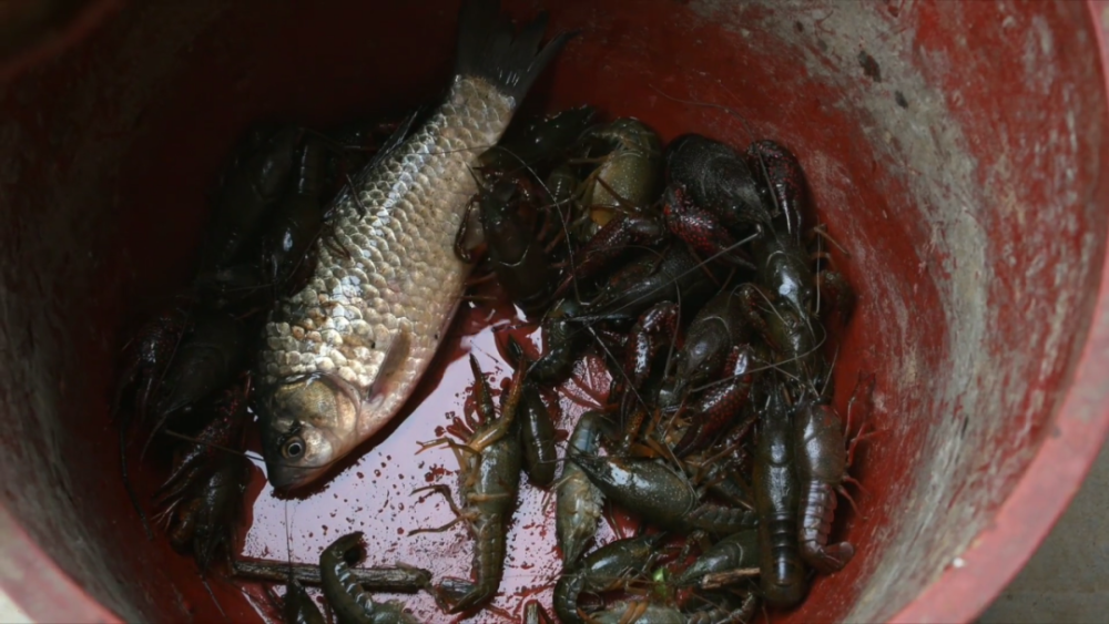 网里的小鱼拼命呼吸、放置在脏桶里的大鱼也奄奄一息。