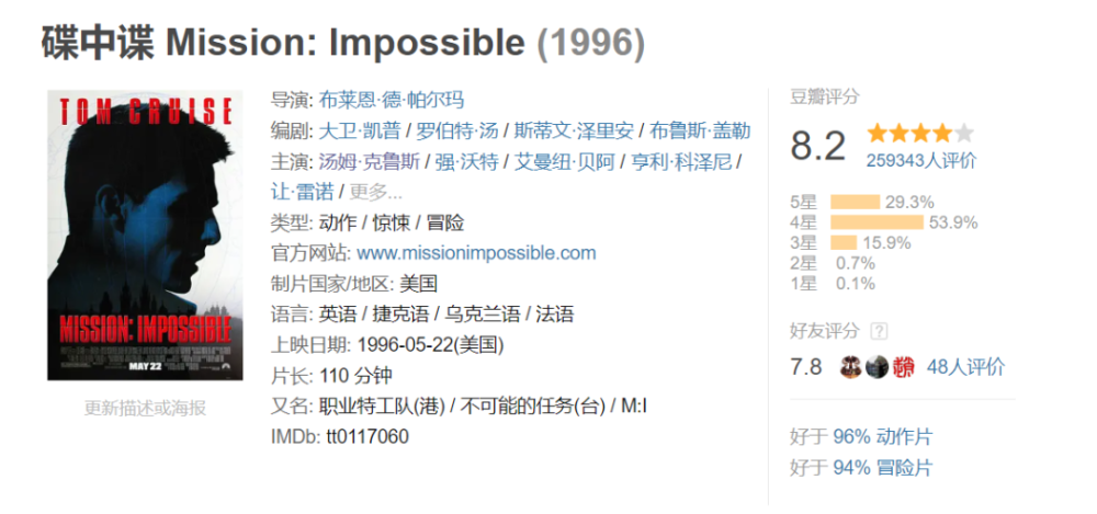 单就这一部影片来说,其实“不可能完成的任务”这个翻译更好,但是“碟中谍”胜在朗朗上口。而且,“不可能完成的任务”,云山雾罩,不易理解。就像“Inception”直译成“奠基”,就很难理解影片在讲什么,翻译成“盗梦空间”,一下子让人豁然开朗,成了绝佳的翻译。“碟中谍”,被理解为“间谍中的间谍,特工中的特工”,则成了美丽的错误。