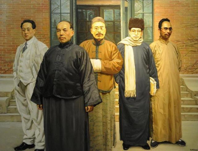 (陈丹青油画-国学研究院的大师们,从左至右分别为赵元任、梁启超、王国维、陈寅恪、吴宓)