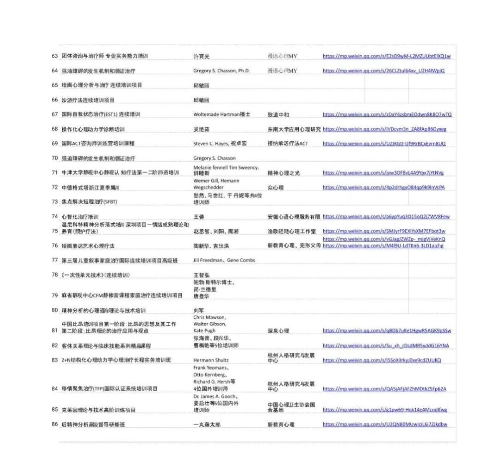 我找了几位小伙伴花了一天时间,把中国心理学会最近 4 年里认可的 146 项培训整理出来了,经过去重后,还有 86 个培训内容,这些培训你可以在这里看到,有课程的报名链接,发布培训信息的公众号、网站、机构等等。