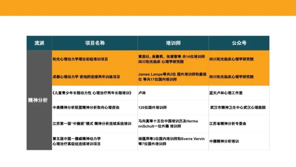 目前国内有四大流派培训:精神分析是一类、认知行为是一类、以人为中心是一类、家庭治疗是一类。