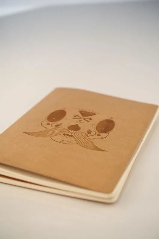 各种插图激光刻在彩色的痣皮上。将插图激光雕刻到卡片笔记本中。
