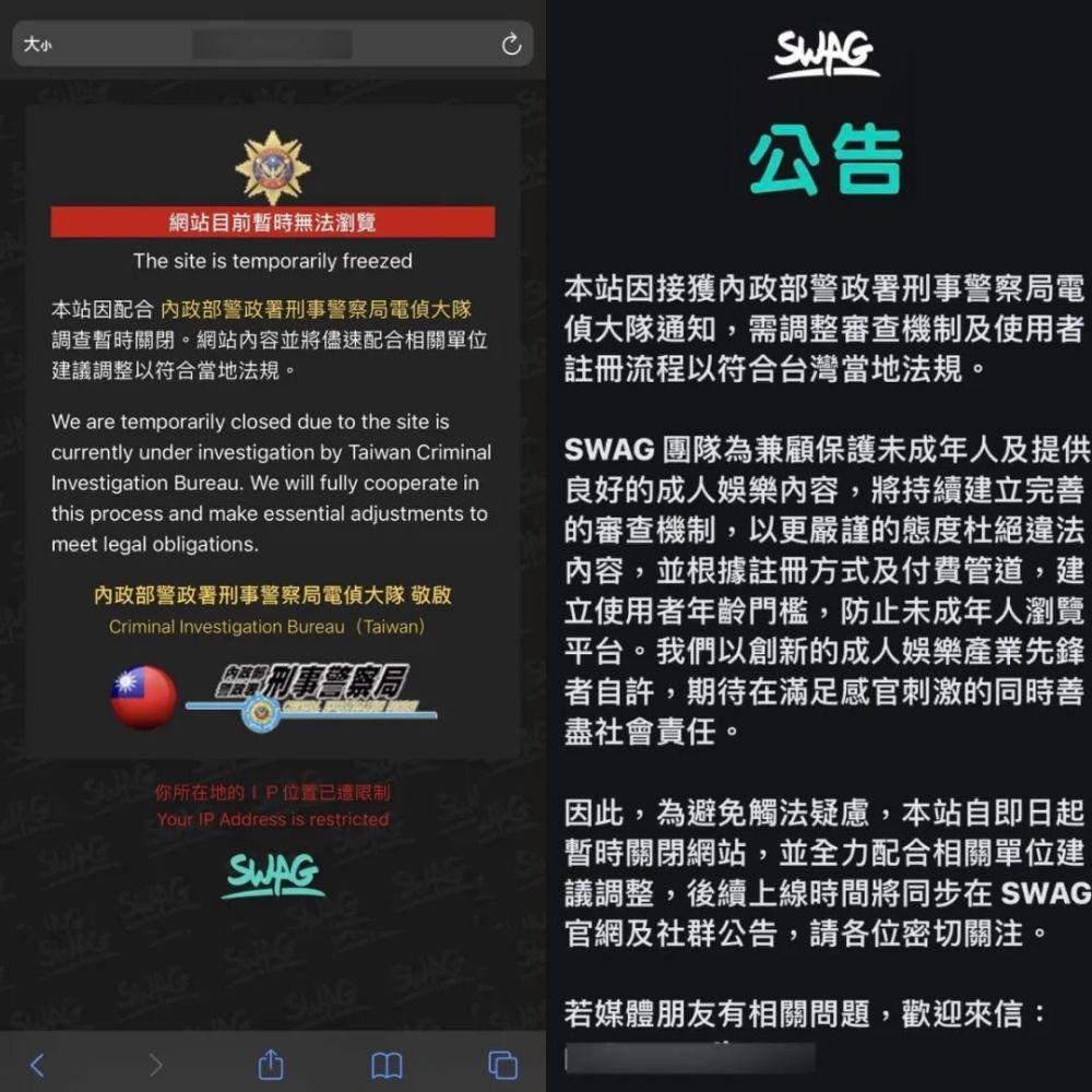 近日,据台湾媒体报道,红极一时的业界成人网站SWAG被台湾刑事局查封,该网站由黄立成在2016年8月创办,后于2017年12月转手由 Sam Liu(34岁)经营。这次在台北市的行动带回了包括刘姓负责人在内的35人进行调查,经过审讯后5名重要成员以妨害风化罪被移送,并封锁网站。