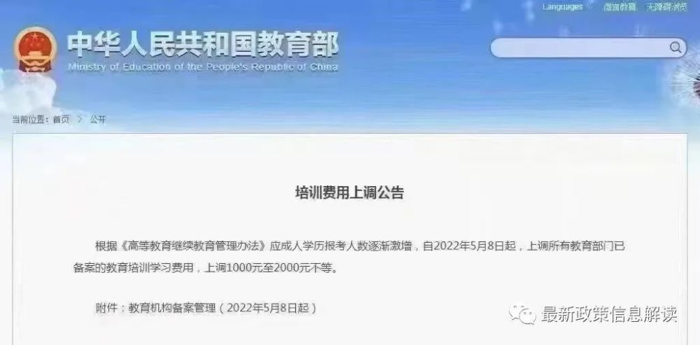 自2022年5月8日起,成人学历继续教育学费上调1000元至2000元不等。