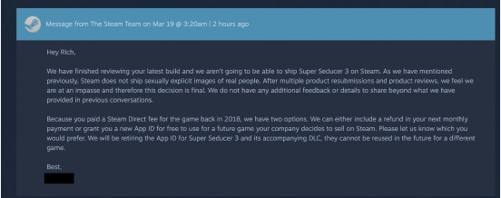 并称:“Steam不会发售带有真人色情图片的游戏作品。”