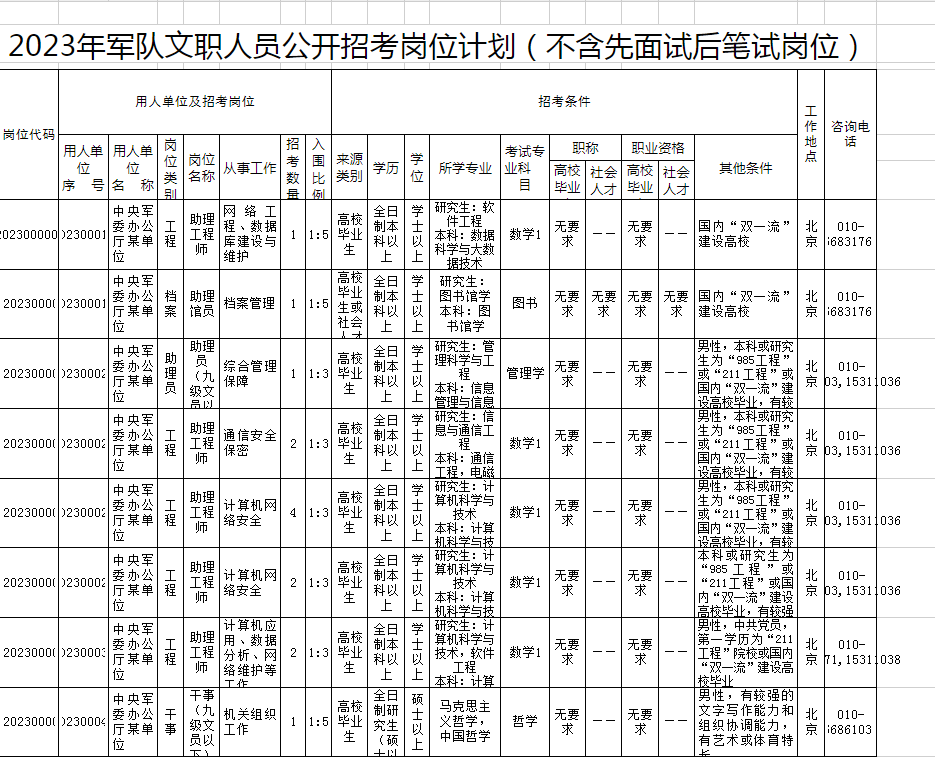 2023年军队文职人员公开招考咨询服务电话和电子邮箱