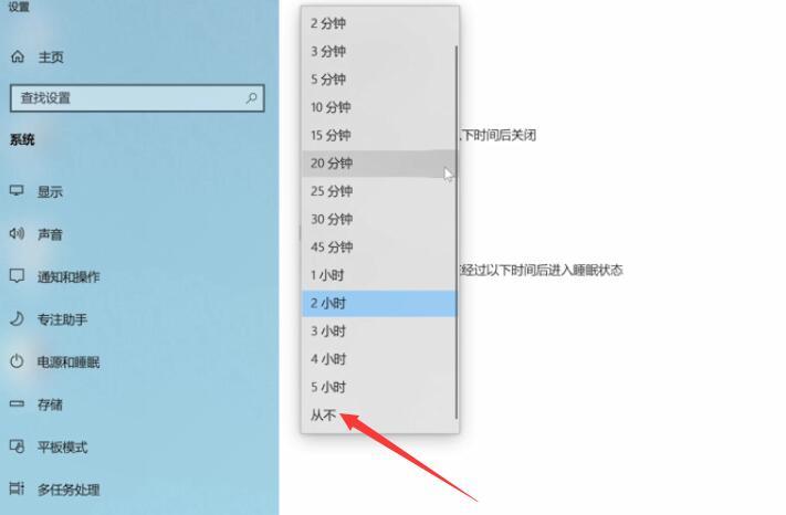 2第二步选择电源和睡眠,展开自动关闭屏幕时间选项,选择从不,即可关闭自动关闭屏幕功能