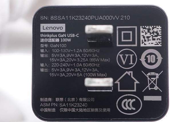 thinkplus GaN 100W口红电源采用固定式插脚设计,与初代相同;并且插脚端面板印有充电器的规格参数铭文。