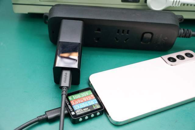 在110V 60Hz 电压下为三星 S22+充电,功率为9.11V 3.69A 33.65W。